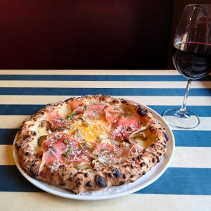 今回は旬の舞茸、モッツァレラと卵を乗せて焼き上げ、仕上げに生ハムとパルメザンチーズをトッピングしました。