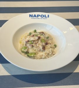マルデナポリでは春の豆と帆立の桜リゾットをご用意しております。